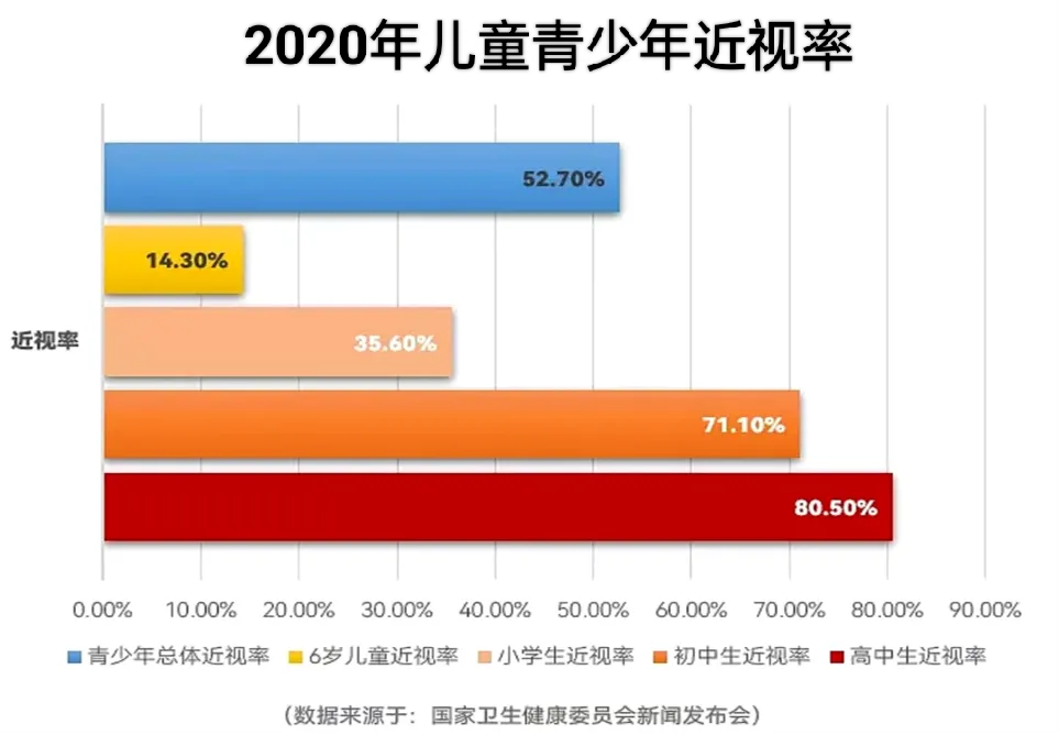 當(dāng)前,近視人口的快速增加已經(jīng)成為一個(gè)不容忽視的全球公共衛(wèi)生問題。據(jù)國家衛(wèi)生健康委公布的2020年我國兒童青少年近視率相關(guān)數(shù)據(jù)顯示,2020年全國兒童青少年總體近視率為52.7%,其中6歲兒童為14.3%,小學(xué)生為35.6%,初中生為71.1%,高中生為80.5%,呈高發(fā)、低齡化趨勢。