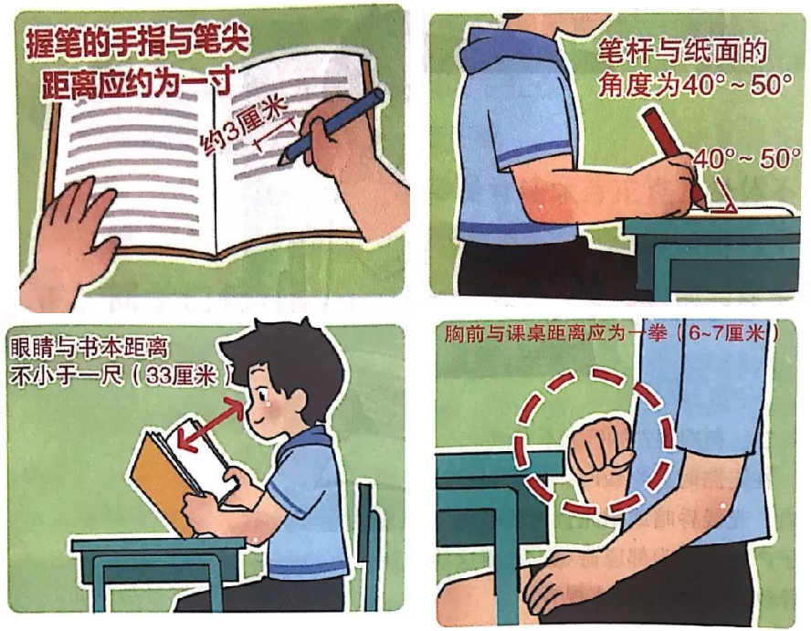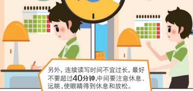 持續(xù)、近距離用眼易誘導(dǎo)近視形成。學(xué)習(xí)閱讀時(shí),要保持合理近處用眼距離,建議大于30—40厘米用眼,相對越遠(yuǎn)對眼睛越好。書寫姿勢建議做到“一尺一拳一寸”,即眼與書本的距離要保持一尺以上,身體與課桌之間保持一個(gè)拳頭的距離,握筆時(shí)手指尖和筆尖要保持一寸的距離。連續(xù)用眼20分鐘,建議休息遠(yuǎn)眺幾分鐘,即“3個(gè)20”,閱讀等近距離用眼20分鐘,向20英尺外(約6米),抬頭遠(yuǎn)眺至少20秒以上。