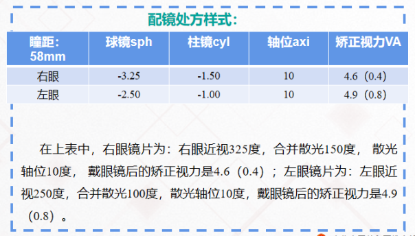 配鏡處方樣式與解讀:在電腦驗(yàn)光或檢影驗(yàn)光之后,進(jìn)行主覺驗(yàn)光、試戴矯正,而配鏡的處方需要根據(jù)個(gè)體差異進(jìn)行調(diào)整,與年齡、戴鏡習(xí)慣、雙眼視功能參數(shù)等均相關(guān),需要醫(yī)生綜合考慮給出一個(gè)“最適宜”孩子的配鏡處方。比如表單中球鏡sph -3.25、柱鏡cyl-1.50、軸位axi10、矯正視力VA4.6(0.4),表示為右眼近視325度,合并散光150度,散光軸位10度,戴眼鏡后的矯正視力是4.6(0.4)。